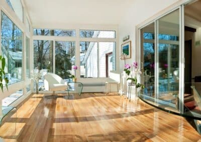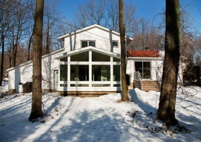 We created an extension to the house with a custom four-season solarium in Sainte-Julie. This space serves as a relaxation, reading, and resting area, nestled among the trees. We kept the patio door between the house and the solarium to create a truly distinct, enclosed room, separate from the noise of the house. It’s a beautifully clean space, harmonious with perfect and timeless symmetry, inviting rest.