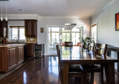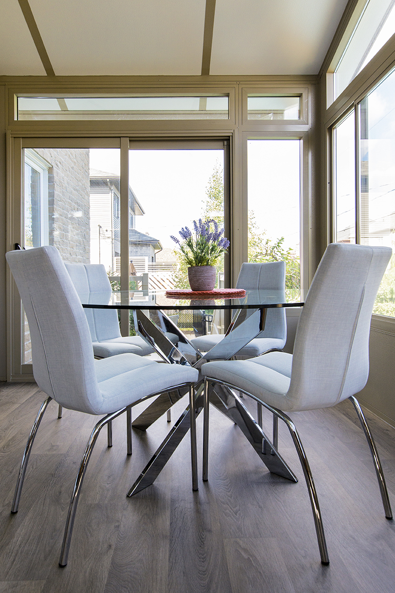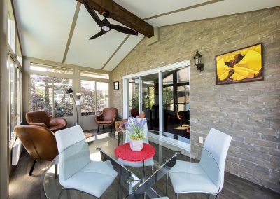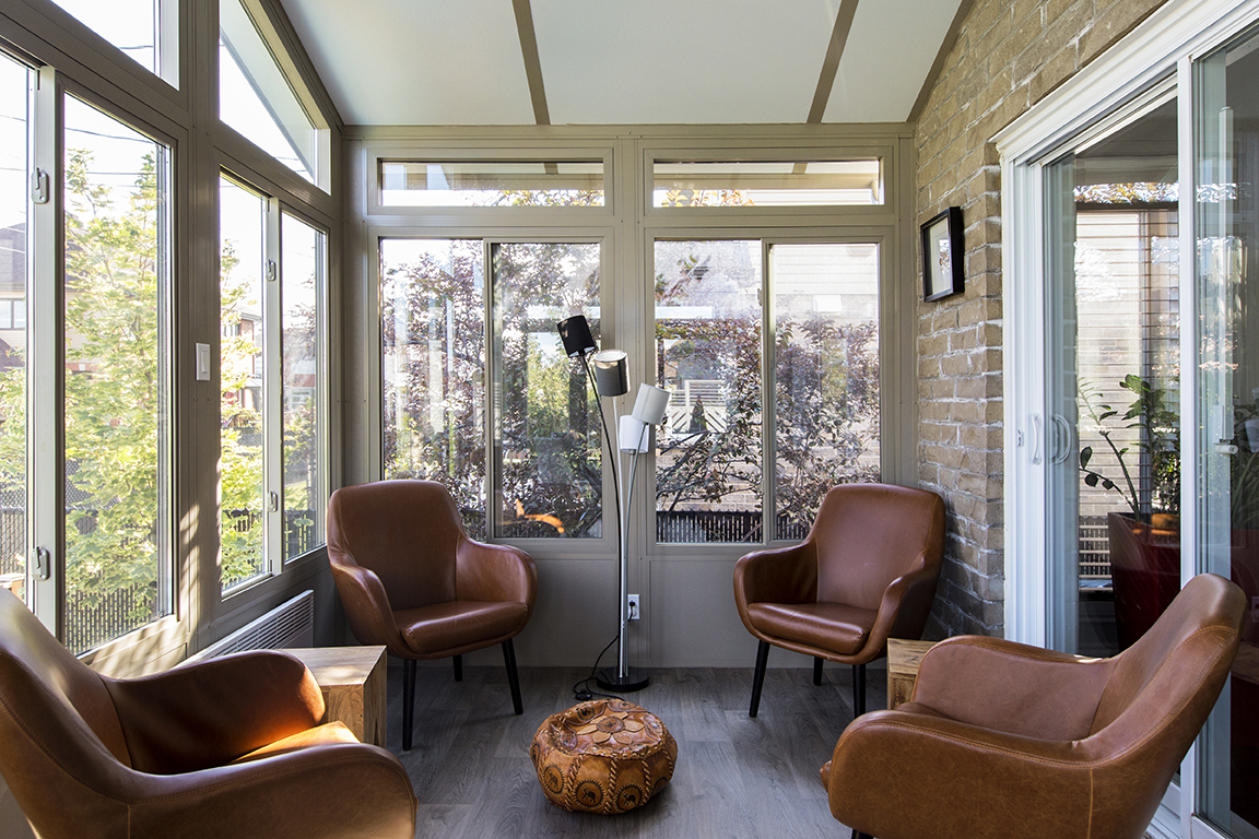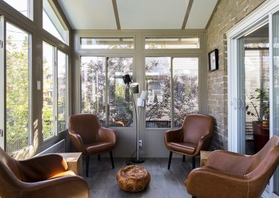 A long and narrow project designed to create two distinct spaces without taking up too much room. A lounge area and a dining area in the same bright room. The cathedral ceiling creates a sense of grandeur despite the 8′ depth!